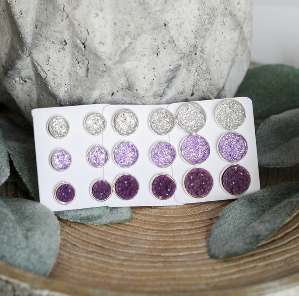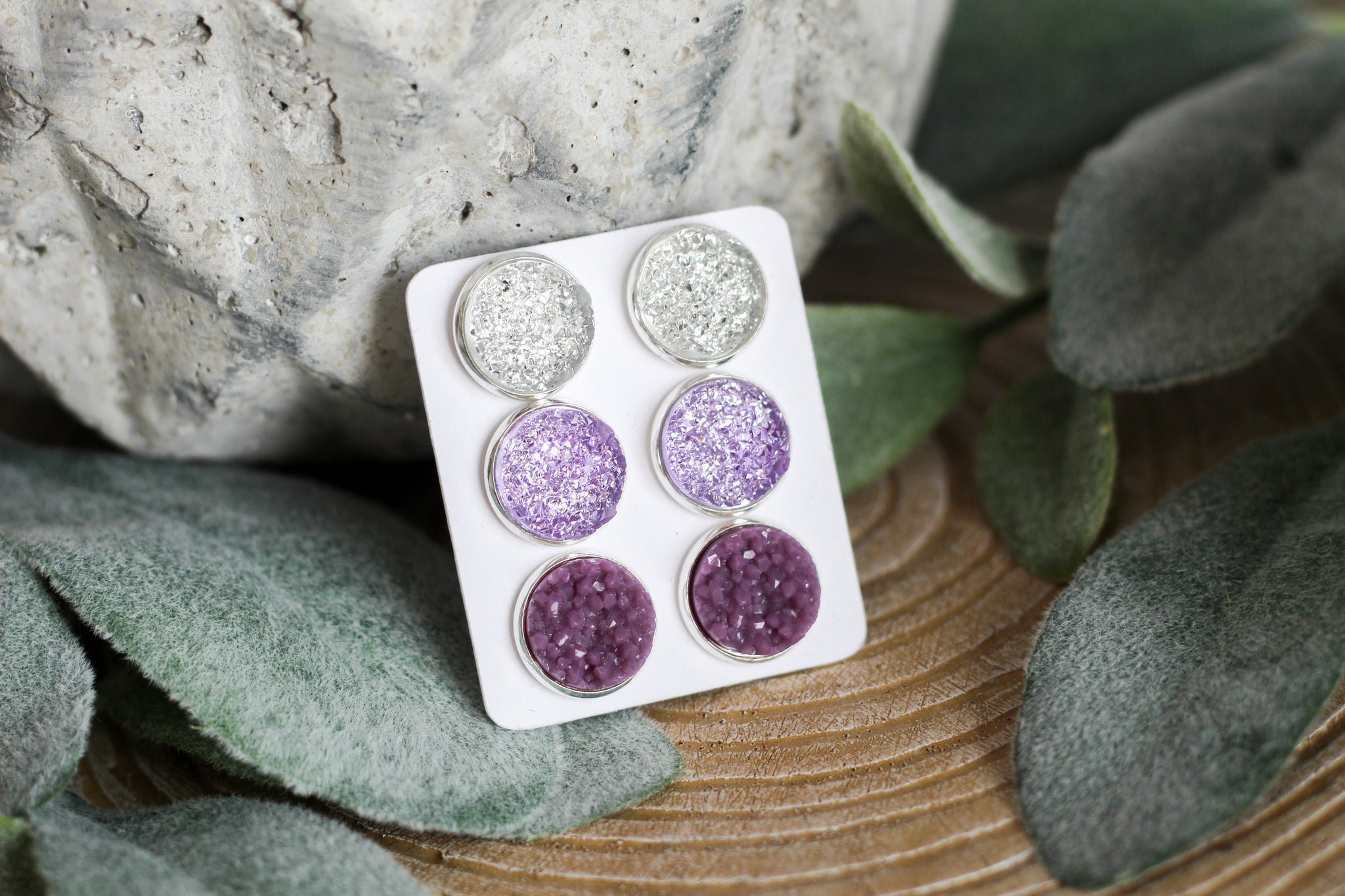 All earrings are made of lead and nickel free hypoallergenic material for sensitive ears. Metal and rubber backing clasps are included on the backs. Each piece comes on its own individual blank white cards.